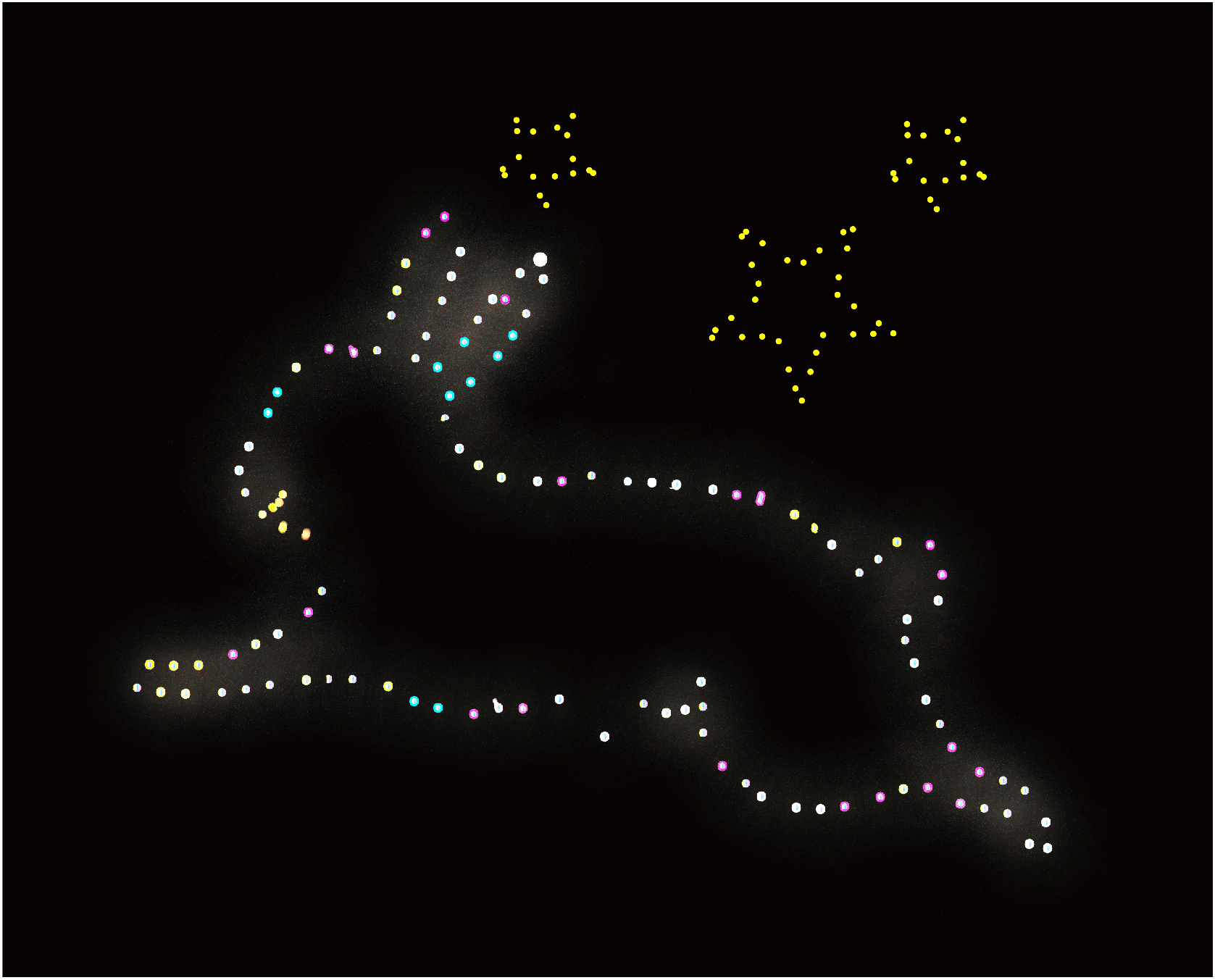 プラスチック板に蛍光性の素材を使って、暗闇でゆらゆら光るモビール型の作品をつくります。