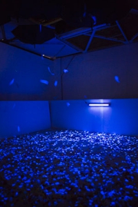 真暗なスペースに青白く光る紙吹雪が舞落ちてくる、光・音響・香・触感と連動した体感型・参加型インスタレーション。