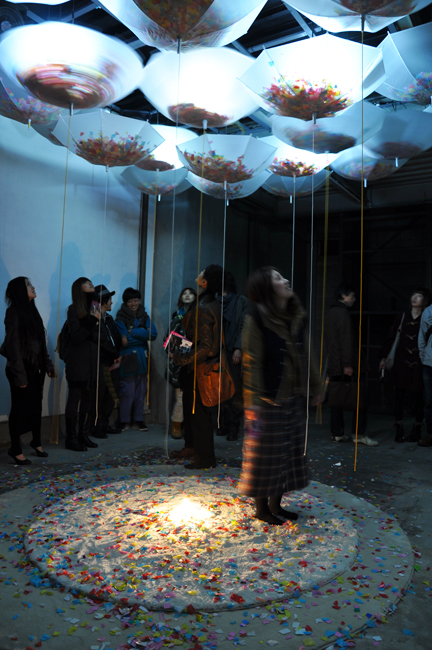 プログラムタイマーによりサーキュレーターがON/OFし、傘に仕込んである紙吹雪が舞い落ちてくる。光・音響と連動した体感型・参加型インスタレーション。天井と床の光が交互に効き、鑑賞者の影を映し出す。ワークショップによって鑑賞者に紙吹雪を作製してもらい、インスタレーションに組み込む。