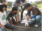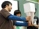 生卵を高い所から落としても割れない装置を画用紙を中心とした簡単な素材でつくり、実験するワークショップです。グループでアイデアを出しながら1チーム3種類の装置をつくります。
