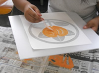 樫尾小学校の4年生を対象に、家の家紋マークと、家紋のルーツやエピソードなどを調べてもらいます。それを元に、色とりどりの砂で、自分だけのオリジナルな家紋を作ります。ライトボックスに入れ、インスタレーションします。