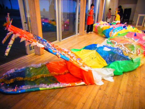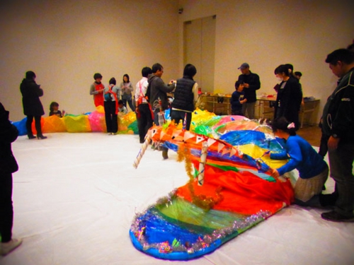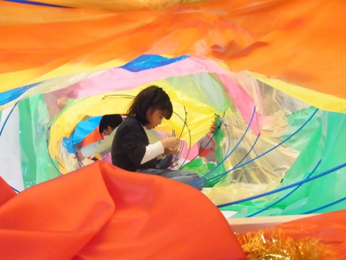 セロファンやビニール、アルミホイルなどを使ったワークショップによって制作した作品を、照明、音響などを使用して川口アートアトリアの大きなギャラリーにインスタレーション。