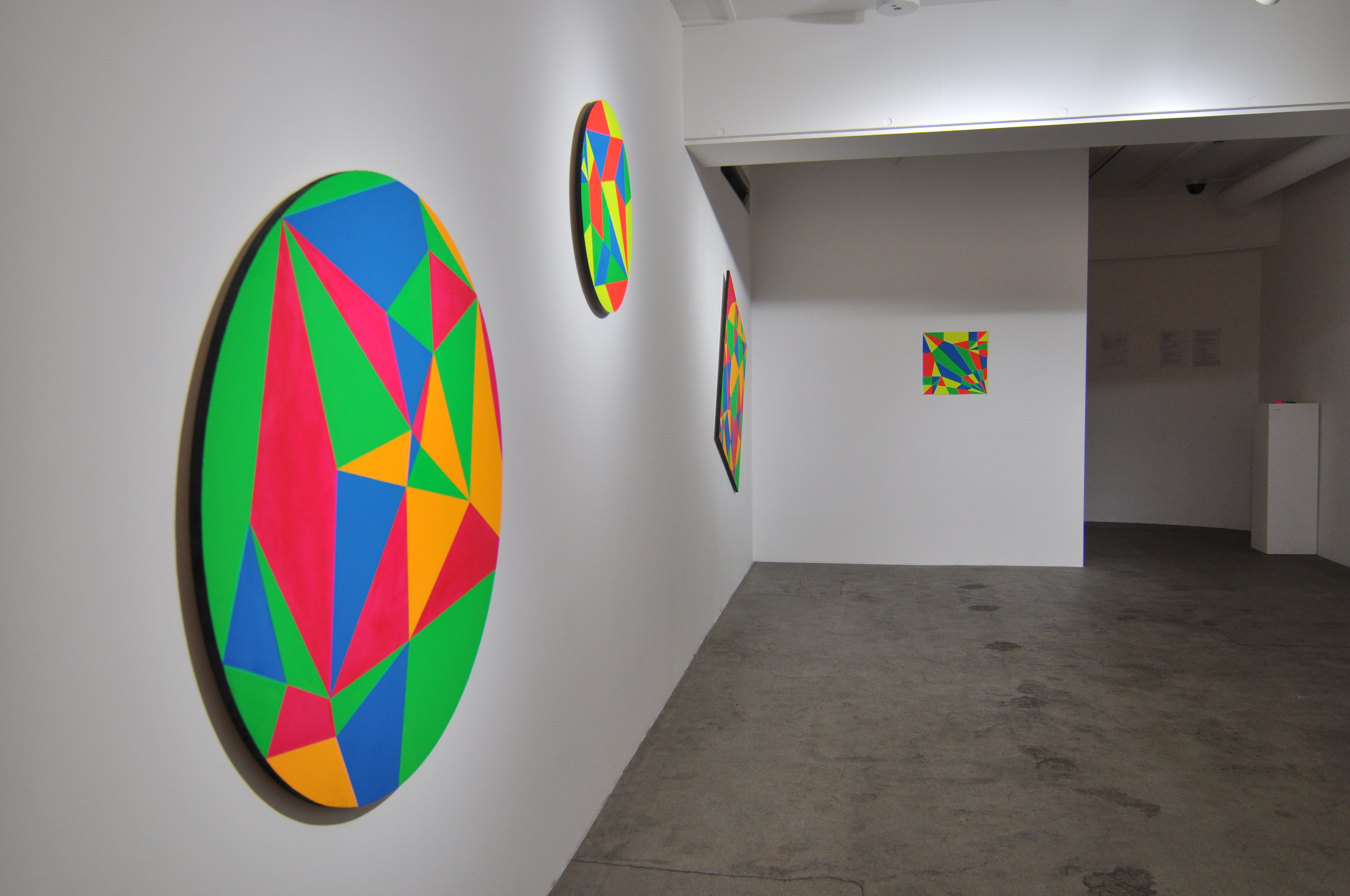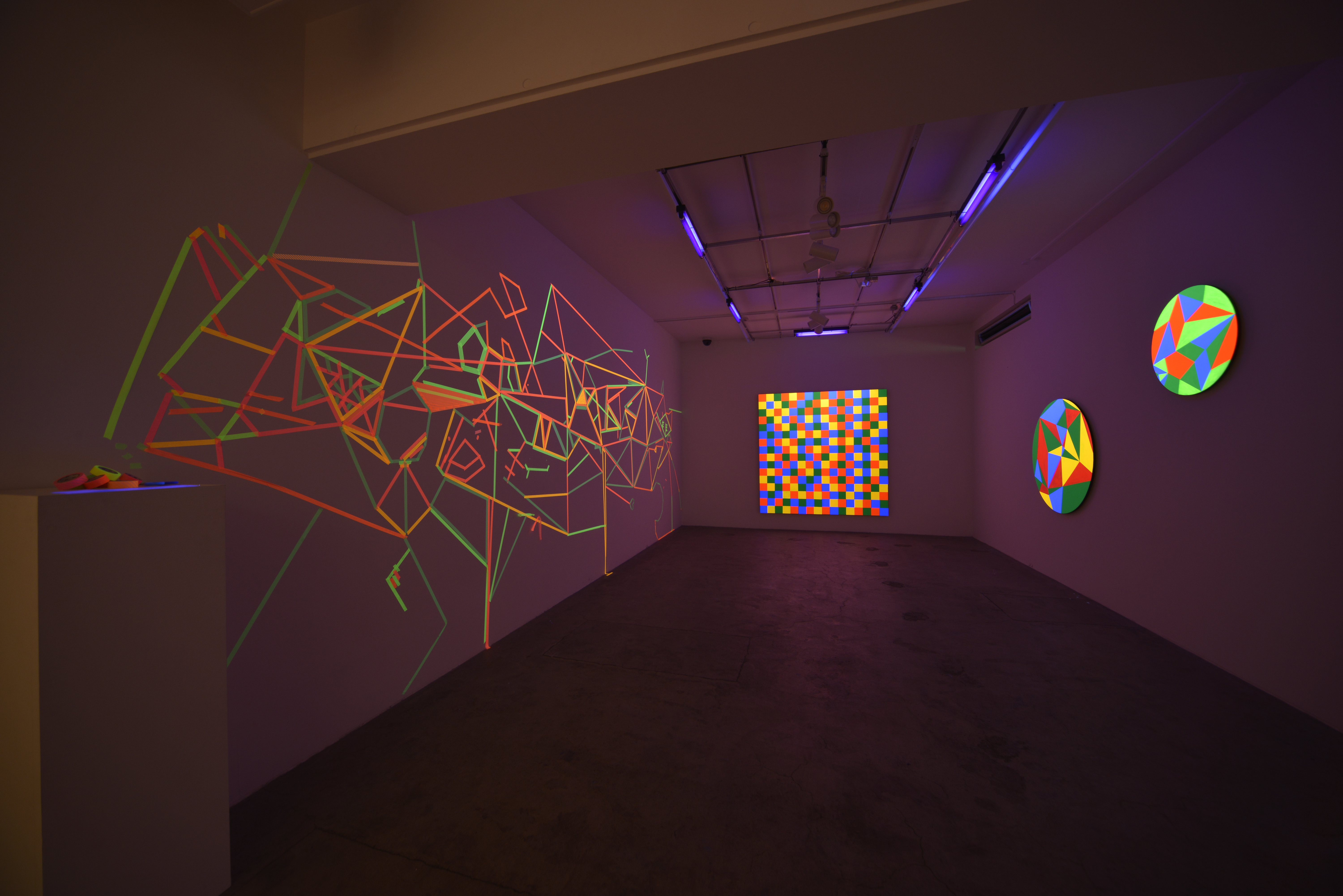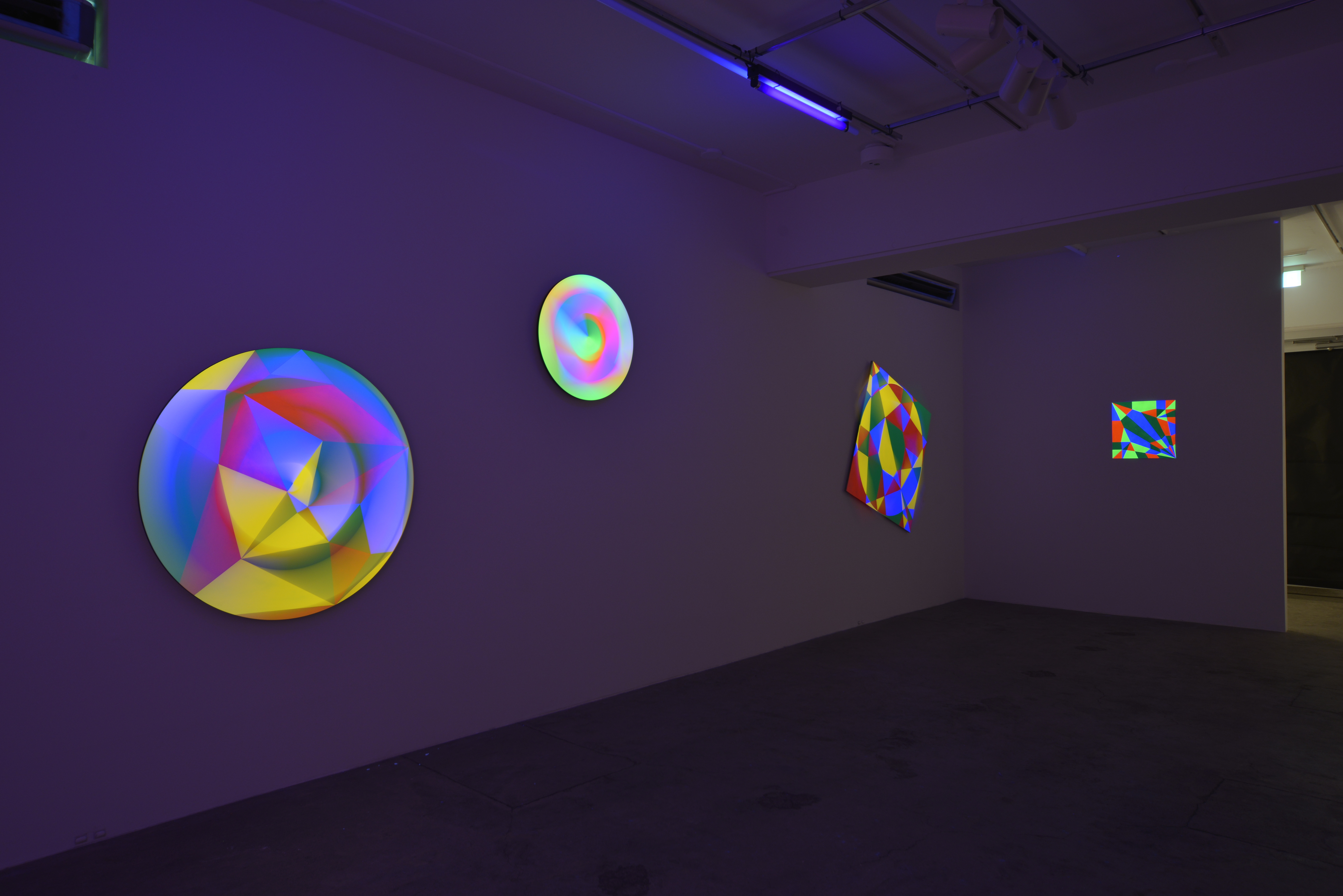 絵画状の作品は、天地の定めがなく定期的に回転する。また、昼光色のLEDライトとブラックライト照明が数分おきに切り替わり、作品の見え方が変化する。
